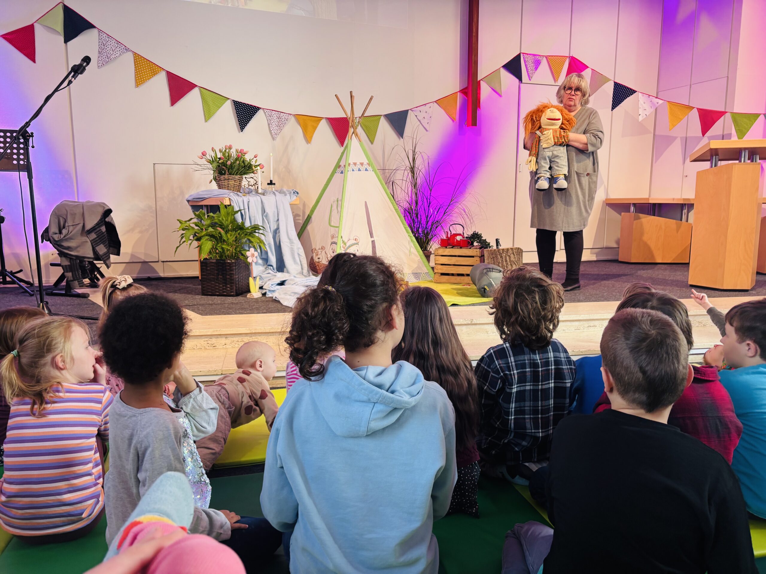 Diesen Sonntag war ein Zelt aufgebaut mit Lagerfeuer, Schlafsack und alles was man zum Campen benötigt. Nachdem wir zwei Bewegungs – Kinderlieder gesungen haben kam Lucie. Lucie (unsere Handpuppe) war ganz erstaunt, dass wir nicht draußen zelten konnten. Gemeinsam haben wir dann die Geschichte von Berti und Hugo gehört. Die beiden Freunde wollten den perfekten Camping Ausflug machen, doch manchmal läuft nicht alles nach Plan. Doch auch wenn alles anders kommt als man denkt, ist es wichtig das Schöne darin zu sehen. Gute Freunde um sich zu haben, und die Wunder zu erkennen.