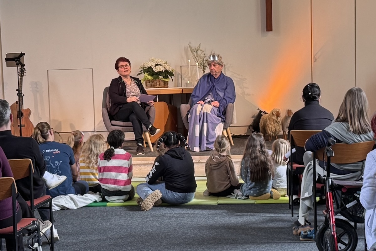 Ein besonderes Highlight erwartete uns auf der Bühne: König David höchstpersönlich war zu Besuch. Mit viel Lebendigkeit erzählte er, warum er vor rund 3000 Jahren den Psalm 23 geschrieben hat. Seine Worte machten deutlich, dass er sich – trotz aller Herausforderungen und selbst als König – immer von Gott begleitet, beschützt und geführt wusste. Sogar in dunklen und schwierigen Zeiten fühlte er sich getragen und geborgen.